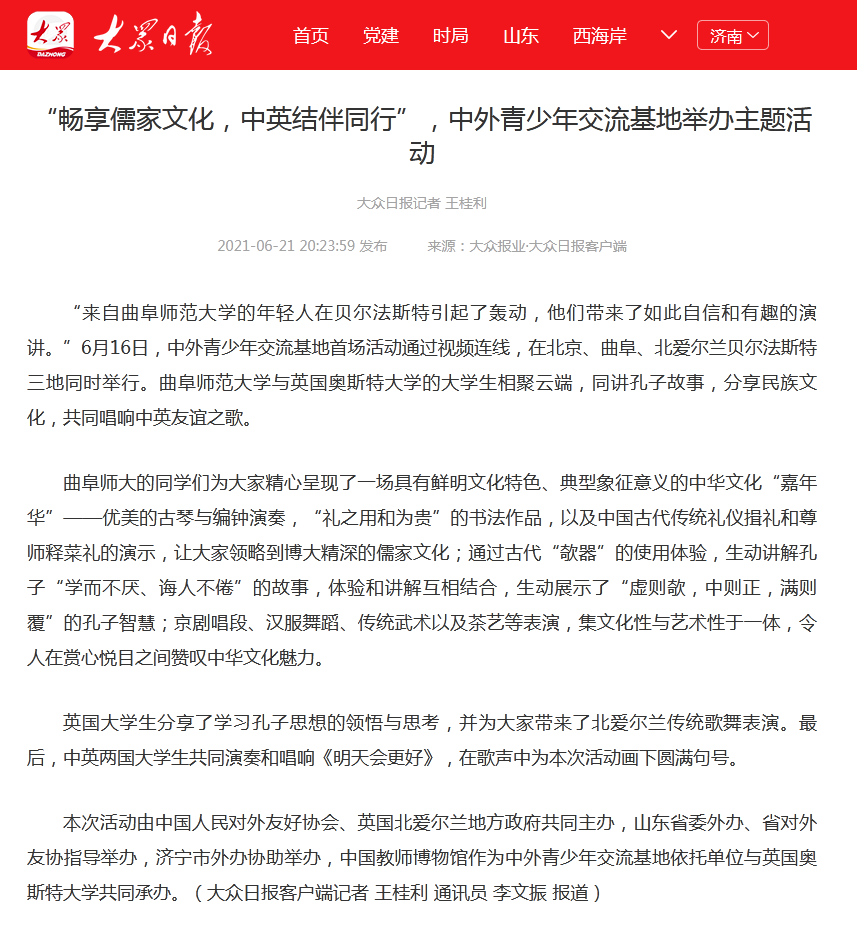 大众日报:“畅享儒家文化,中英结伴同行”,中外青少年交流基地举办主题活动