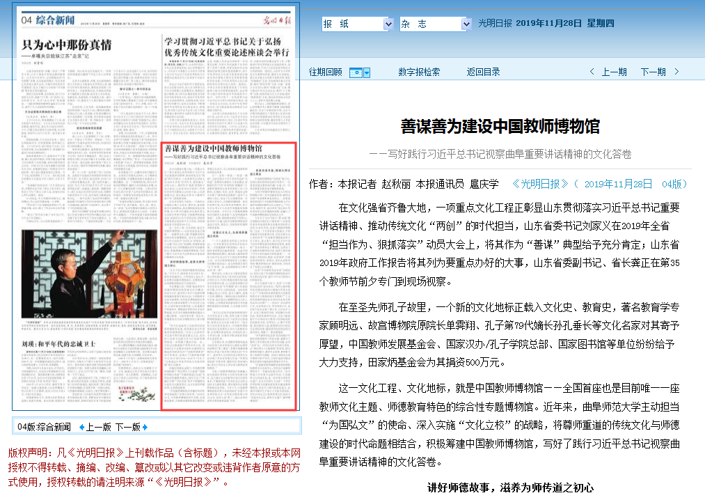 从“一名师一展堂,一展堂一精神”、立体呈现古今中外名师风范的“名师堂”,到聚焦朴素面孔与身边感动、讴歌新时代“四有”好老师的“群像馆”,中国教师博物馆让前来参观的大中小学教师,在观物、知史、见贤、明道的过程中实现了“教育者先受教育”,滋养了立德树人初心、坚定了弘文励教使命。自首展以来至今,中国教师博物馆一直对外免费开放,共计接待各类教师、青少年学生等6万人次进行师德教育和教师文化体验。今年9月,中国教师博物馆名列榜首入选首批“山东省师德涵养基地”。近期,根据教育部的工作指示,曲阜师大正着力把中国教师博物馆打造成示范性、特色化、国家级的师德师风教育基地。