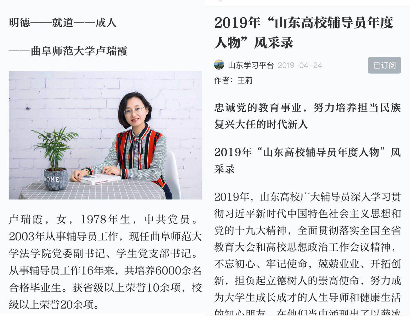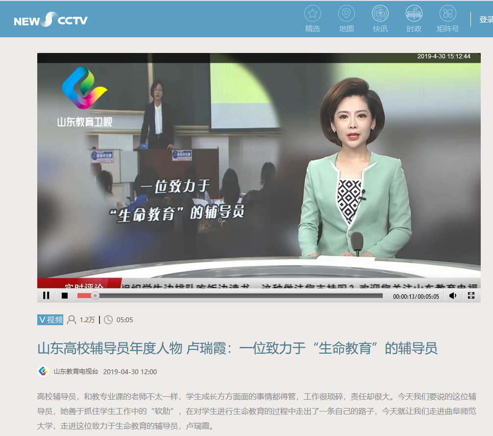 学习强国报道2019年“山东高校辅导员年度人物”卢瑞霞老师