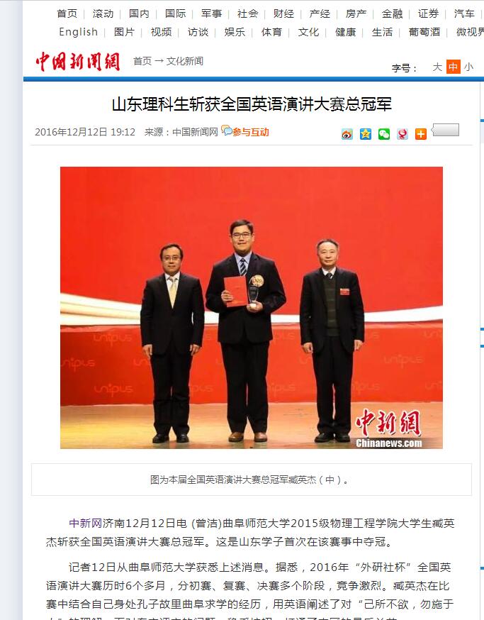 中国新闻网:山东理科生斩获全国英语演讲大赛总冠军