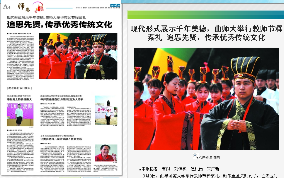 济宁晚报《曲师大尊师重道薪火相传》:http://epaper.jn001.com/jnwb/html/2016-09/10/content_175465.htm