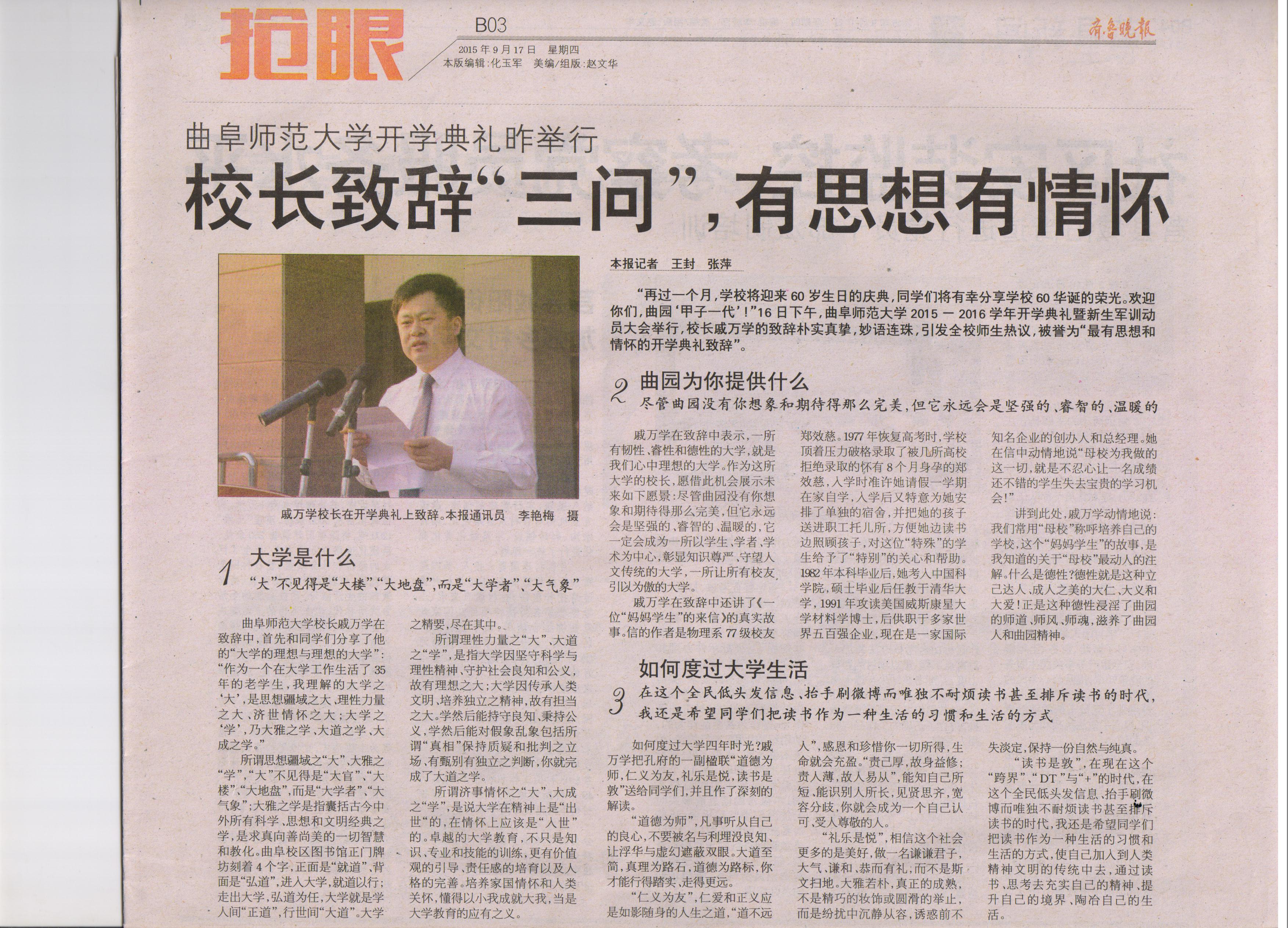 齐鲁晚报:开云链接官网开学典礼,戚万学校长致辞“三问”,有思想有情怀