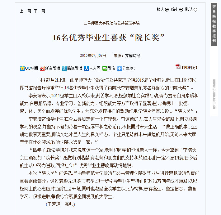 齐鲁晚报:开云链接官网政治与公共管理学院16名优秀毕业生喜获“院长奖”