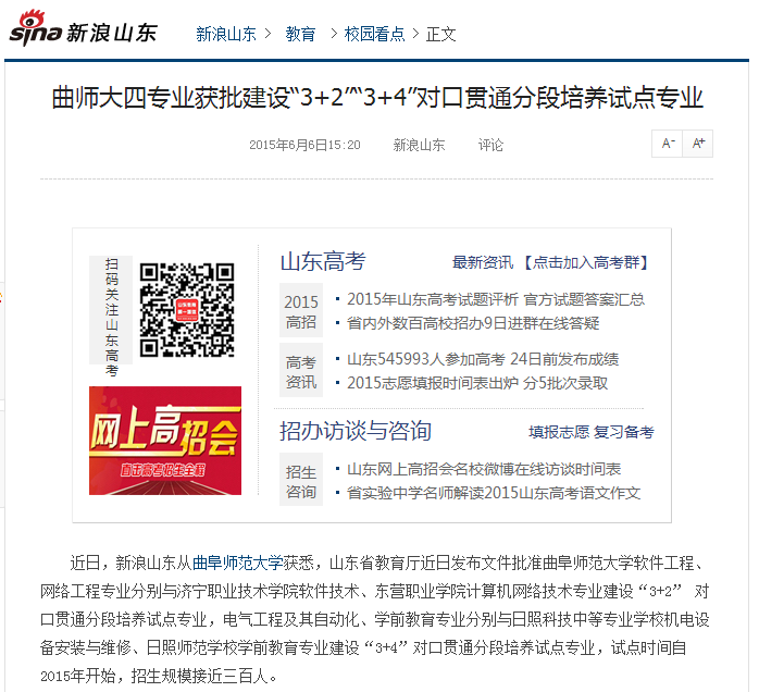 新浪网:曲师大四专业获批建设“3+2”“3+4”对口贯通分段培养试点专业