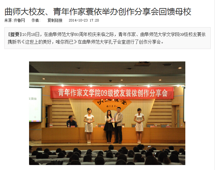 齐鲁网:曲师大校友、青年作家蓑依举办创作分享会回馈母校