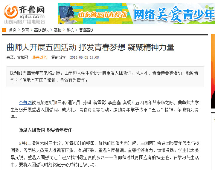 齐鲁网:曲师大开展五四活动 抒发青春梦想 凝聚精神力量