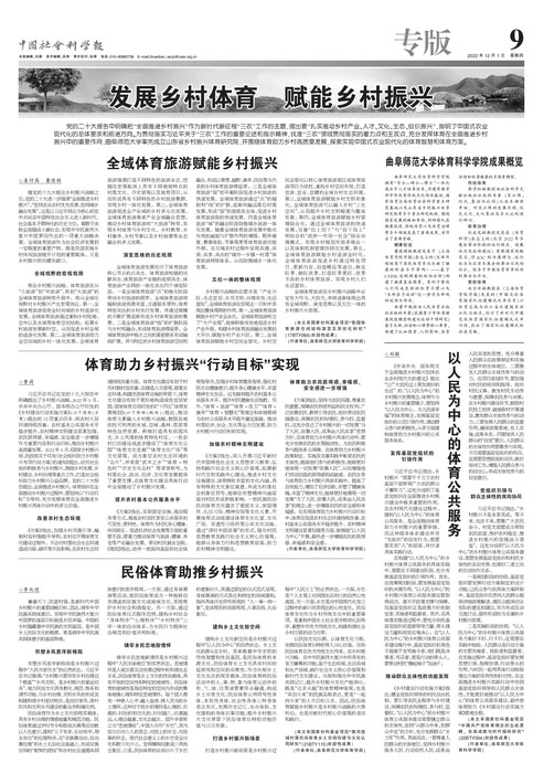 曲阜师大体育科学学院讯 日前,中国社会科学报在“发展乡村体育、赋能乡村振兴”专版中刊登了开云链接官网山东省乡村振兴体育研究院执行副院长曹莉教授团队的系列成果,其内容包括:体育助力乡村振兴“行动目标”、构建以人民为中心的体育公共服务、全域体育旅游赋能乡村振兴、民俗体育助推乡村振兴等主题的阶段性战略研究。报道还对学校体育科学学院近年来取得的相关成绩进行了列举,相关科研成果为全国农村体育发展提供理论依据和现实借鉴,标志着团队的研究在乡村体育领域处于省内领先地位、对全国乡村体育研究形成较大影响。