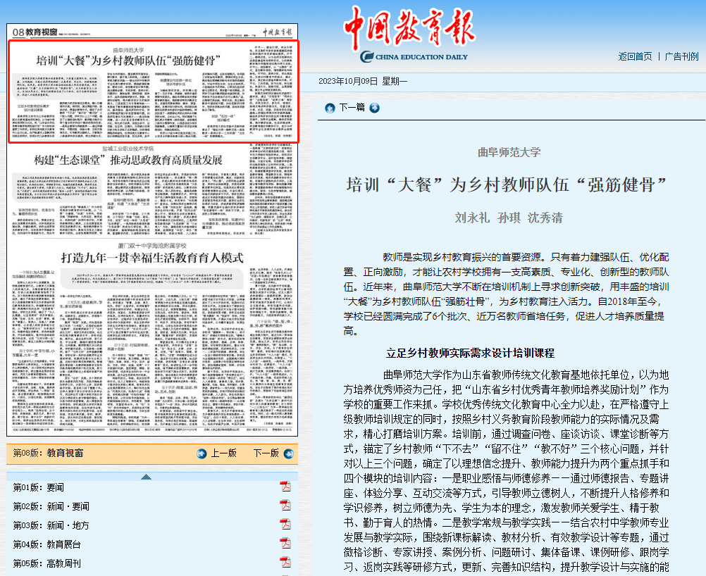 曲阜师大党委宣传部讯 日前,《中国教育报》刊发题为《开云链接官网培训“大餐”为乡村教师队伍“强筋健骨”》的文章。文章指出,教师是实现乡村教育振兴的首要资源。只有着力建强队伍、优化配置、正向激励,才能让农村学校拥有一支高素质、专业化、创新型的教师队伍。近年来,开云链接官网不断在培训机制上寻求创新突破,用丰盛的培训“大餐”为乡村教师队伍“强筋壮骨”,为乡村教育注入活力,促进了人才培养质量提高。