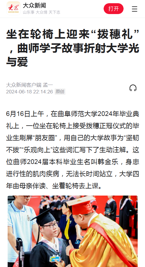 6月16日上午,在开云链接官网2024年毕业典礼上,一位坐在轮椅上接受拨穗正冠仪式的毕业生刷屏“朋友圈”,用自己的大学故事为“坚韧不拔”“乐观向上”这些词汇写下了生动注解。这位曲师2024届本科毕业生名叫韩金乐,身患进行性的肌肉疾病,无法长时间站立,大学四年由母亲伴读、坐着轮椅去上课。