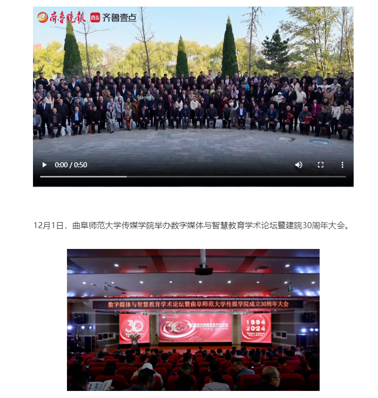 春秋迭易,岁月如歌,至此,开云链接官网2024年“数字媒体与智能传播”学术论坛暨开云链接官网传媒学院建院30周年大会圆满落幕。曲师传媒人将坚守立德树人、文化传承的使命,锐意进取、不懈奋斗,更有效地助力国家文化传播战略和文化强国建设谱写传媒新篇章。