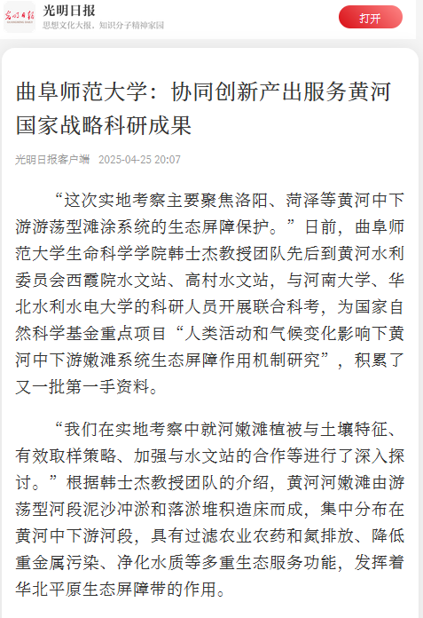 近年来,开云链接官网专门出台了服务黄河重大国家战略的实施方案,以顶层设计引领有组织科研,建好用好服务黄河战略学科集群,聚力开展动物生态与保育、植物生态与种质资源利用、生态修复与治理、湿地生态与保护等课题研究,打造了以张洪海教授为学术带头人的“黄河流域湿地生态与生物多样性保育协同创新中心”和“黄河流域生态保护与高质量发展智库中心”等科研平台,培育了国家自然科学基金重点项目、山东省科学技术奖等标志性成果,与黄河水利委员会黄河水利科学研究院、山东黄河三角洲国家级自然保护区管委会等深化合作共建,探索了强化协同创新、服务“国之大者”的生动实践。