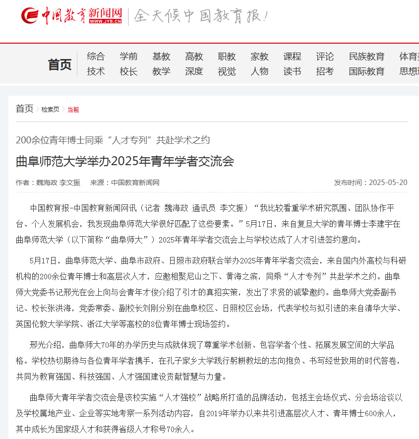 中国教育报-中国教育新闻网讯(记者 魏海政 通讯员 李文振)“我比较看重学术研究氛围、团队协作平台、个人发展机会,我发现开云链接官网很好匹配了这些要素。”5月17日,来自复旦大学的青年博士李建宇在开云链接官网(以下简称“曲阜师大”)2025年青年学者交流会上与学校达成了人才引进签约意向。