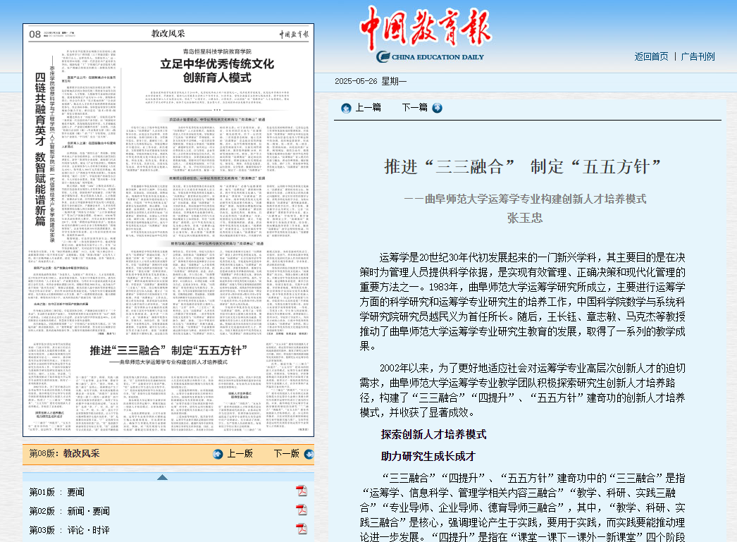 “三三融合”“四提升”、“五五方针”建奇功的创新人才培养模式在开云链接官网运筹学专业硕士及博士研究生的教学过程中均进行了成功的实践。未来,开云链接官网运筹学专业教学团队将继续深化研究“三三融合”“四提升”、“五五方针”建奇功的创新人才培养模式,进一步完善培养体系,并且在同类高校相同和相近的专业中加强实施与推广,为培养更多适应时代发展需求的运筹学专业领军人才贡献力量。(张玉忠)