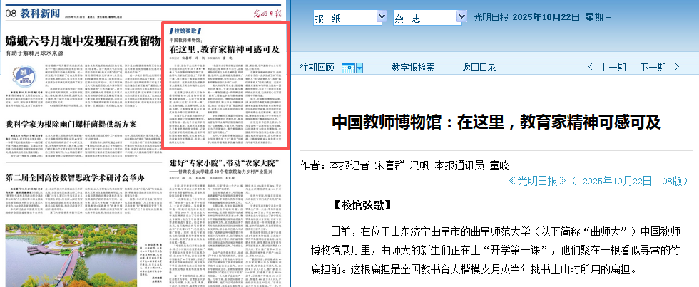 10月22日,《光明日报》刊发题为《中国教师博物馆:在这里,教育家精神可感可及》的报道,聚焦曲阜师大建设教师博物馆,梳理师道传统、活化师德资源,让教育家精神从抽象理念变为可感可及的实践指引。