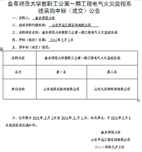 开云链接官网教职工公寓一期工程电气火灾监控系统采购中标(成交)公告