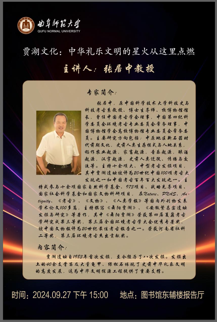 主讲人简介:张居中,原中国科学技术大学科技史与科技考古系教授、博士生导师、校博物馆馆长,曾任中国考古学会理事,中国第四纪科学委员会环境考古专业委员会常务理事,中国博物馆学会高校博物馆专业委员会常务委员。主要研究方向包括:中原地区新石器时代前期文化,史前人类生存模式与人地关系,稻作农业起源,家畜起源,音乐起源,酿酒起源,汉字起源,史前人类迁徙、传播与交流等。主持十余项大、中型考古发掘项目,其中贾湖遗址被评为20世纪中国100项考古大发现之一和中国考古百年百大发现之一。主持或参与十余项国家自然科学基金、973项目、战略先导项目、国家社会科学基金和国家文物科研项目, 在Nature、PNAS、Antiquity、《考古》、《文物》、《人类学报》等国内外刊物发表学术论文100多篇,主持撰写《舞阳贾湖》、《安徽繁昌窑遗址发掘与研究》等著作,其中《舞阳贾湖》荣获第四届夏鼐考古学研究成果三等奖,第三届全国环境考古学大会优秀专著奖,被中国文物报评为20世纪最佳考古报告之一。荣获河南省社科二等奖,第三届环境考古杰出贡献奖。