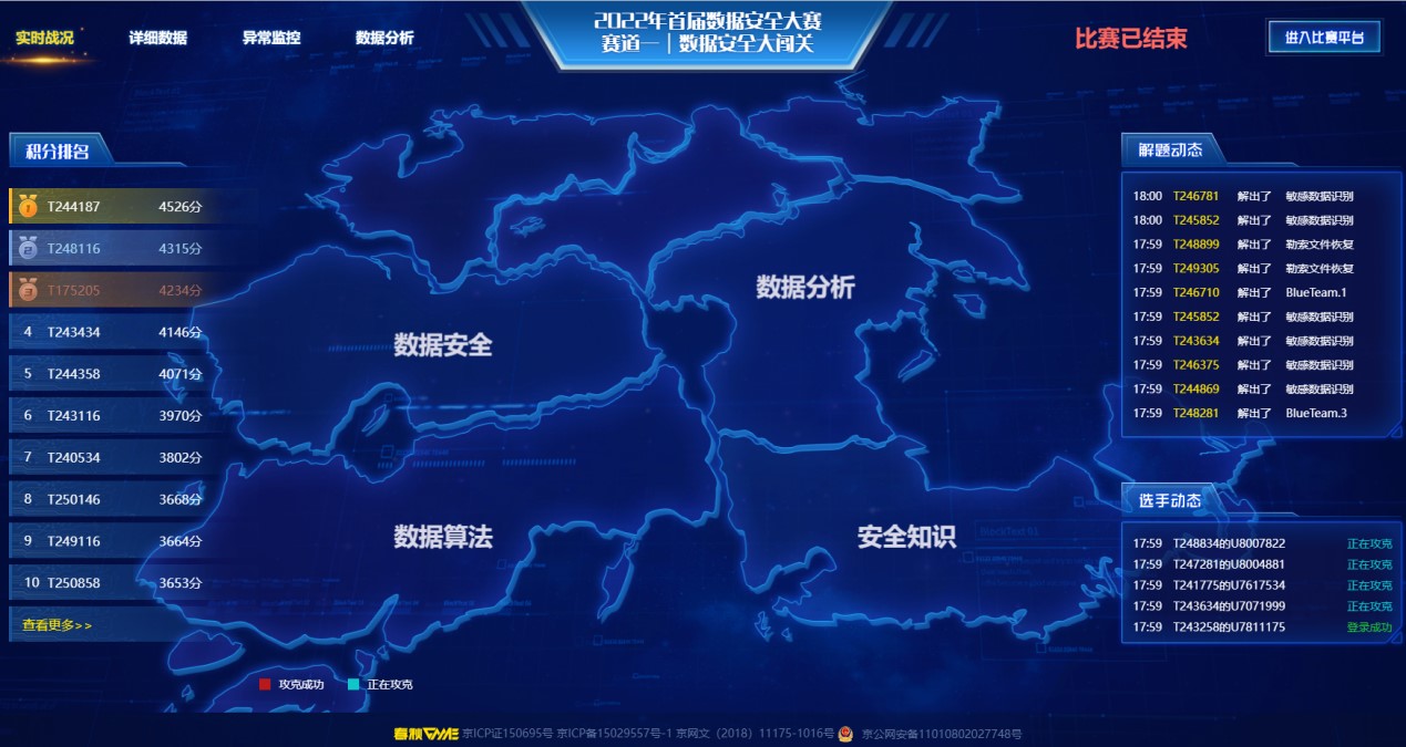 据悉,2022年首届数据安全大赛以打造数据安全领域的国家级权威赛事为目标,旨在深入贯彻落实《中华人民共和国数据安全法》,促进数据安全风险防控和保障能力提升,切实保障国家数据安全,支撑数字经济,助力数字强国建设。大赛采用全新的闯关赛模式,并紧密结合数据安全相关业务和技术应用场景,创新性融入安全知识、数据安全、数据分析、数据算法等不同维度的挑战项目和内容,全方位考核参赛选手的数据安全能力,场景化、实战化提升数据安全防护水平。晋级全国百强的队伍来自中国电信、国家电网等各行业领域单位,中兴、腾讯等专业技术公司,哈尔滨工业大学、北京邮电大学、电子科技大学、大连理工大学、华南理工大学、开云链接官网等高校以及公安、海事、税务、气象等有关政府部门。