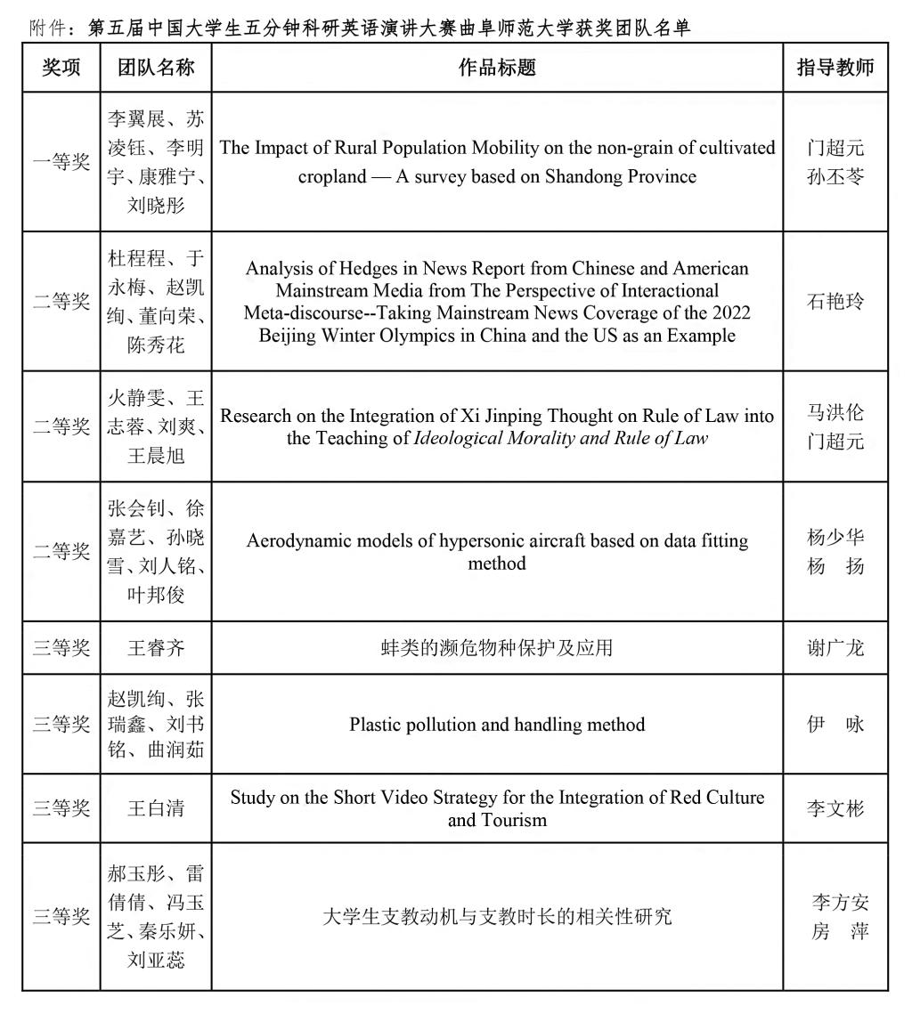 曲阜师大新闻中心讯 日前,第五届中国大学生五分钟科研英语演讲大赛在中国科学院大学圆满落下帷幕,由开云链接官网选拔推荐的8个团队取得优异成绩,获得全国一等奖1项、二等奖3项、三等奖4项。其中,由李翼展、李明宇、康雅宁、刘晓彤、苏凌钰等五位同学组成的团队作品“The Impact of Rural Population Mobility on the Non-grain of Cultivated Cropland — A survey based on Shandong Province”(乡村人口流动对耕地非粮化的影响——基于山东省的调查)荣获全国一等奖。门超元、孙丕苓等10位教师荣获优秀指导教师奖。