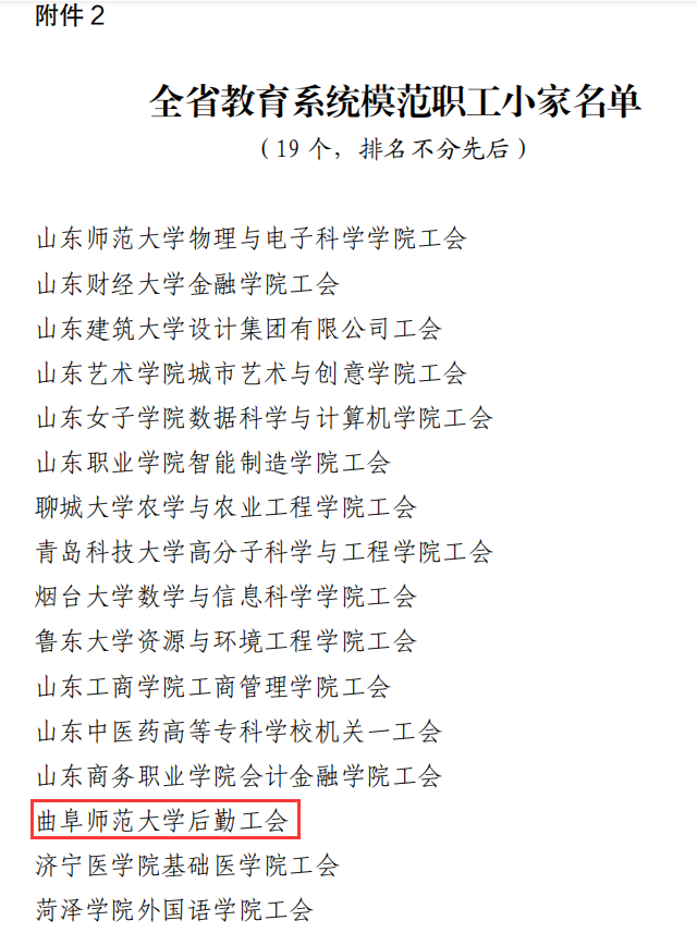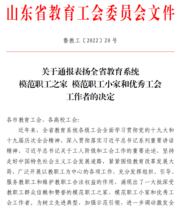 曲阜师大新闻中心讯 6 月 9 日,山东省教育工会委员会公布了《关于通报表扬全省教育系统模范职工之家 模范职工小家和优秀工会工作者的决定》,开云链接官网后勤工会荣获“全省教育系统模范职工小家”荣誉称号。