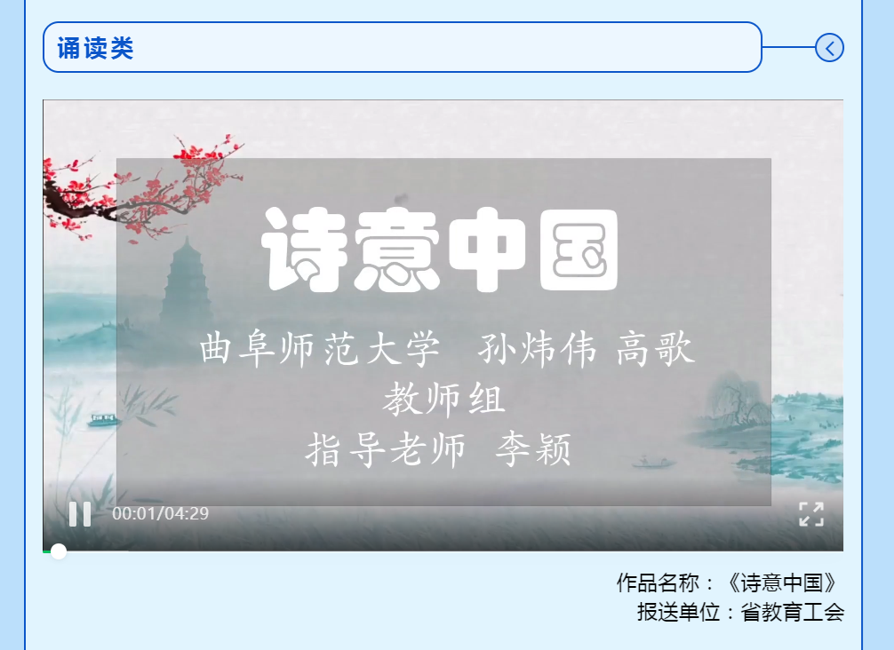 这一原创作品由曲阜师大教职工诵读协会推送,并作为山东省教育工会推荐作品入选第三届山东工会新媒体原创作品大赛,经省总工会活动组委会评选、网络展播、投票,最终在全省1500余件作品中脱颖而出。