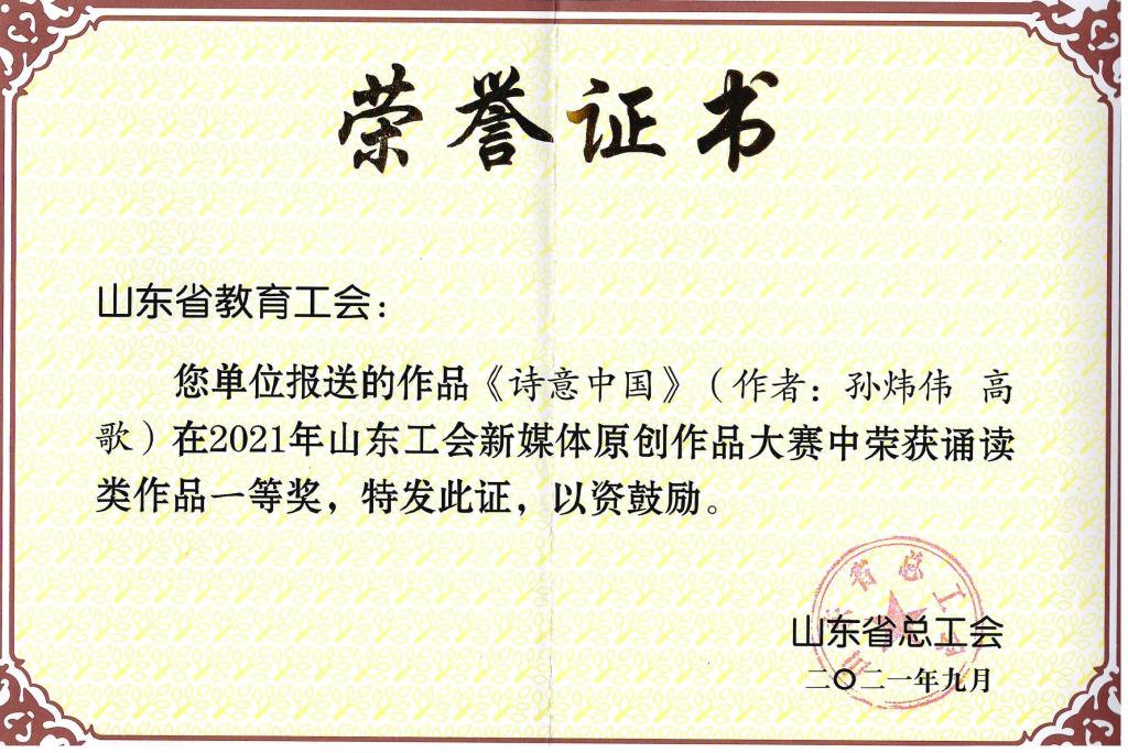 曲阜师大新闻中心讯(通讯员:孙衍)日前,曲阜师大孙炜伟教授和高歌教授咏诵的原创作品《诗意中国》,在山东省总工会第三届山东工会新媒体原创作品大赛中荣获诵读类作品一等奖。