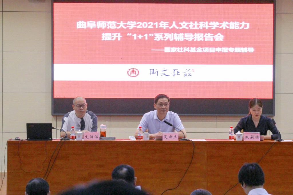 曲阜师大新闻中心讯(通讯员:杜晨曦) 日前,曲阜师大举办人文社科学术能力提升“1+1”系列报告会活动,本次系列辅导共包括“学术提升”和“社科管理”两大主题,旨在提升人文教师学术创新能力,帮助解决中青年教师学术研究所想所急所盼,是“我为师生办实事”实践活动的具体落实。9月14日、16日,本次系列辅导活动分别在曲阜、日照两校区开班,党委常委、副校长夏云杰、云南大学文传浩教授出席开班仪式,各学院负责人以及两校区文科学者共同参加,社科处处长朱莉雅主持开班活动。