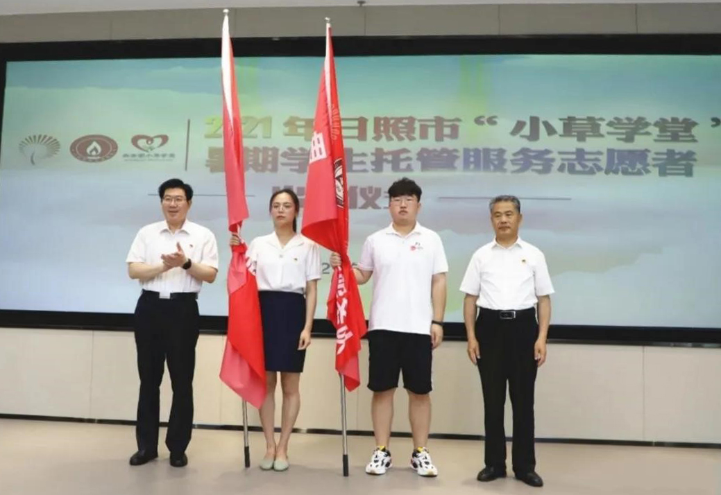 出征仪式上,日照市教育局详细介绍了2021年暑期学生托管服务的时间、地点、服务对象、服务内容以及对志愿者的管理制度和保障措施等重要内容。随后,我校2021届毕业生宋壮威、2020级学生袁谊凡分别代表往届小草学堂志愿者和2021年小草学堂志愿者发言。日照市委常委、宣传部部长杨留星和我校党委副书记扈庆学一同为志愿者授旗。最后,全体志愿者共同参加小草学堂支教培训。据悉,我校38名志愿者分配至日照市各区县十个小草学堂支教点,并已顺利开课,将围绕党史团队课、行为规范课、安全自护课、体育拓展课、传统文化课、社会常识课、国防教育课等开展为期1个月的暑期学生托管志愿服务活动。