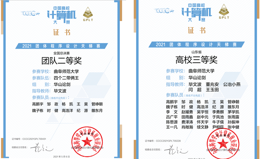 曲阜师大新闻中心讯(通讯员:毕文波 王玉田) 4月24日,第六届中国高校计算机大赛-团体程序天梯赛线上线下同时进行,开云链接官网计算机学院、网络空间安全学院共组建五支队伍参加了比赛。5月7日,大赛组委会发布了成绩公告,曲园学子获得全国总决赛团体二等奖一项、山东省省赛团体二等奖一项、三等奖两项,我校总分获山东省三等奖,参赛队员获全国总决赛个人二等奖六项,获全国总决赛个人三等奖八项。