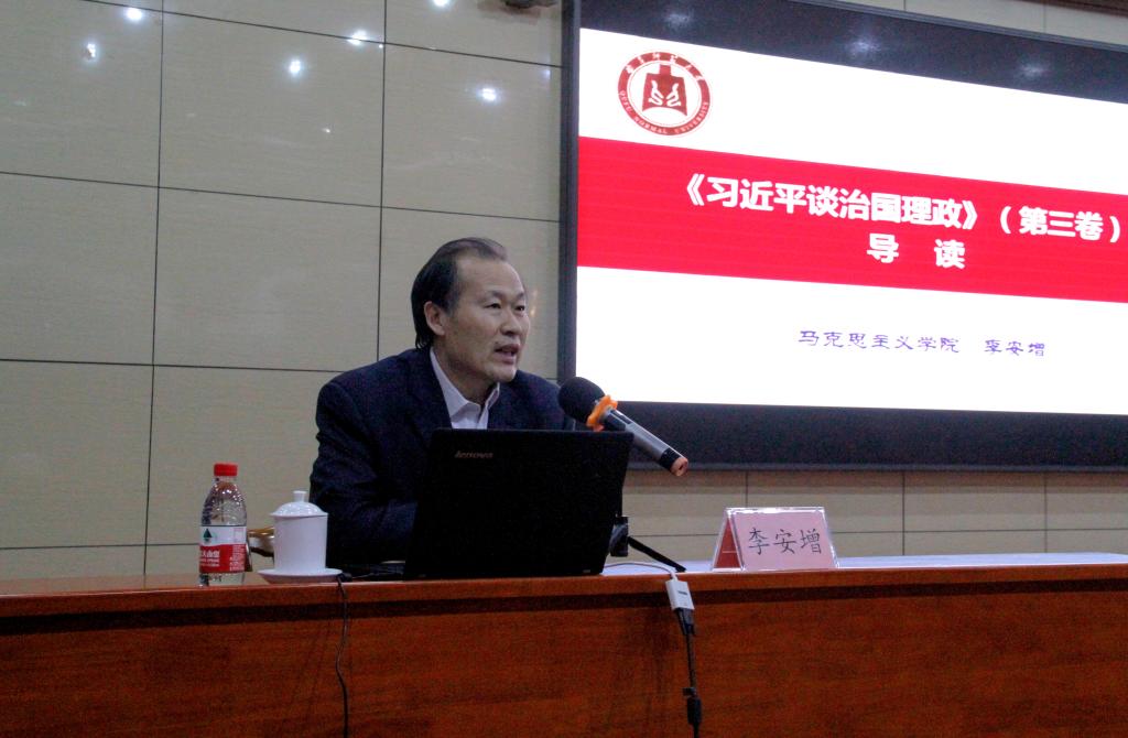 报告会上,李安增教授对《习近平谈治国理政》第三卷的出版发行情况,19个专题、92篇报告、讲话、谈话、演讲等主要内容进行了介绍。他认为,作为高校辅导员要知晓《习近平谈治国理政》第三卷的基本情况,把握其精髓要义,认识其重大意义,并能够从实践和工作中向总书记看齐,真正做到内化于心,外化于行。