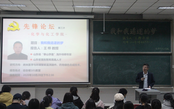 曲阜师大新闻中心讯 日前,为贯彻落实习近平总书记在科学家座谈会上的重要讲话精神,化学与化工学院举办“先锋论坛”系列活动第三讲,“泰山学者”海外特聘专家王桦教授作了题为“我和我追逐的梦——国内外创新创业之旅”的精彩报告,学院党委书记赵琪主持了本次论坛。