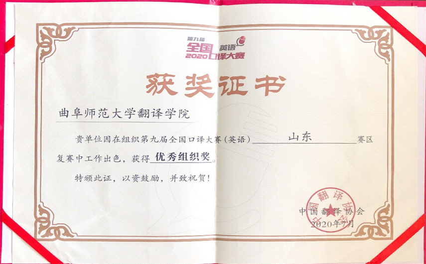 全国口译大赛(英语)由中国外文局指导、中国翻译协会主办,旨在促进翻译学科建设和语言服务行业的繁荣与发展、培养高素质语言服务人才,更好地服务国家发展大局和国际传播能力建设,是最具影响力的全国性口译赛事之一。本届大区赛采用网络形式进行,共有来自9个省的200多名选手同台竞技。比赛采用交替传译形式,分为英译汉和汉译英两个环节,赛题涉及政治、经济、科技、艺术等多个领域,对选手的基本口译能力、知识广度和应变能力进行了全面考察。最终,翻译学院学子凭借扎实的双语能力和良好的心理素质一路过关斩将从山东赛区复赛脱颖而出,顺利完成大区赛。翻译学院也荣获优秀组织奖和优秀团体奖。