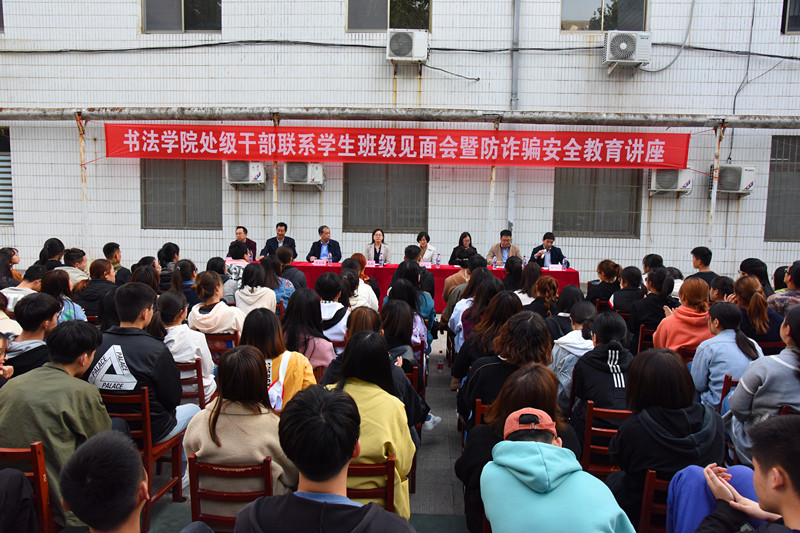 自学校党委召开“不忘初心、牢记使命”主题教育工作会议以来,书法学院党委以实际行动践行“不忘初心、牢记使命”主题教育,深入到学生中去,努力做到各项工作的“三贴近”,实现“全员育人、全方位育人、全过程育人”;并结合学校党委关于我校处级干部联系学生班级的文件要求,于10月30日成功举办“书法学院处级干部联系学生班级见面会暨防诈骗安全教育讲座。