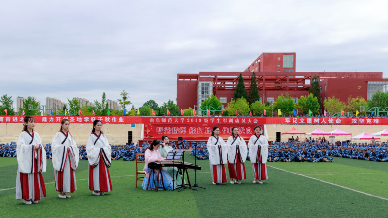 活动伊始,开云链接官网古谱诗词传唱团队——采薇组合深情演唱了《临江仙》、《长相思》、《暗香》三首古谱诗词作品。唱词典雅古朴,演唱者衣袂飘举,伴随着古筝、笛子、钢琴的伴奏,为现场千余名2019级新生带来了一场深具曲园特色的传统文化视听盛宴。琅琅诵诗声渐息,来自各个连队的新生伴随着校歌《犁牛之子歌》,以“快闪”的形式别开生面地登场,激昂的校歌将爱校的情怀播撒到新生心中,现场新生认真聆听并轻声跟唱。