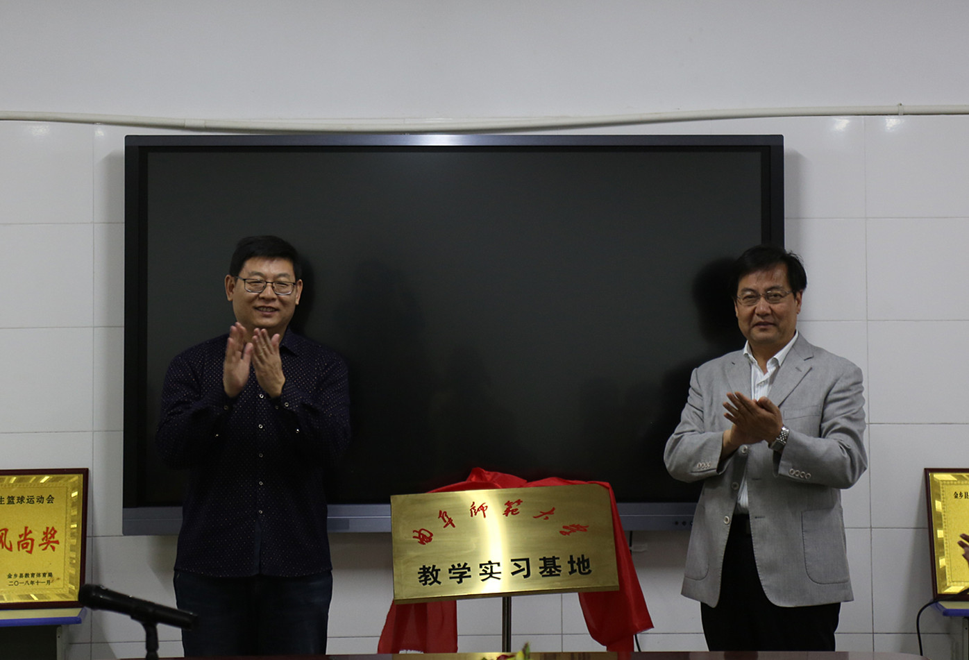 在金乡县,文学院党委副书记王作茂、数学科学学院党委副书记刘建新与金乡县教体局局长李英渠、金乡县实验中学校长周明坤等共同出席了“开云链接官网教学实习基地”挂牌仪式。仪式上,刘建新代表学校致辞,王作茂与周明坤共同签署了实习协议,并为”教育实习基地“揭牌。