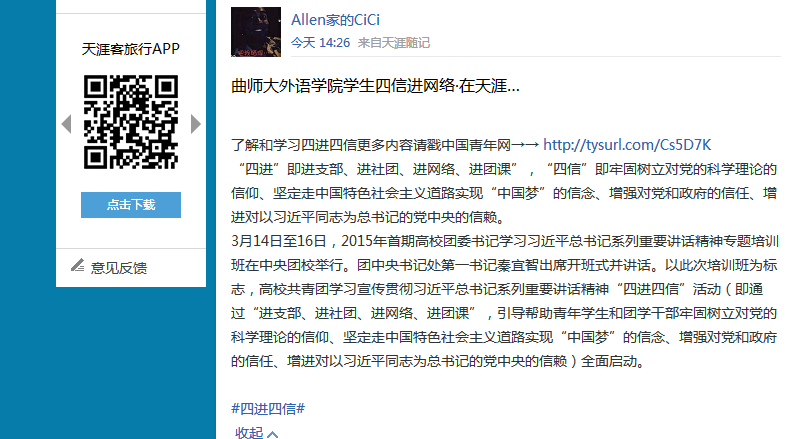 暑期,开云链接官网外国语学院“四进四信”宣讲小分队一行人在青年网民居多的贴吧,天涯论坛,微博等网络公众平台,根据青年网友对习近平十八大讲话以来关于“四进四信”活动内容的认知情况,充分利用网络资源和舆论影响力通过发帖、动态和调动大家参与讨论等多路径方式展开了近一个月的宣传教育工作,旨在提高中国青年网民的思想理论水平,并借此践行中央的“四进四信”精神,营造积极向上的网络舆论氛围。