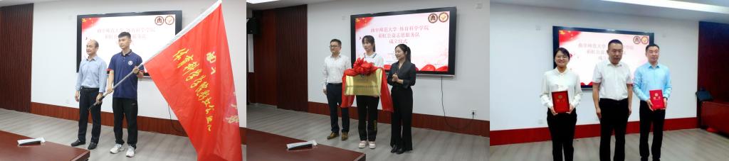 仪式上,邢洪彬为曲师大体育科学学院彩虹公益服务队授旗。孔轶众和池雪共同为体育科学学院彩虹公益志愿服务队揭牌,志愿服务队正式成立。曲阜市彩虹公益服务中心理事长康绪虎为体育学部党委副书记马振华和体育科学学院团委书记刘京颁发聘书。