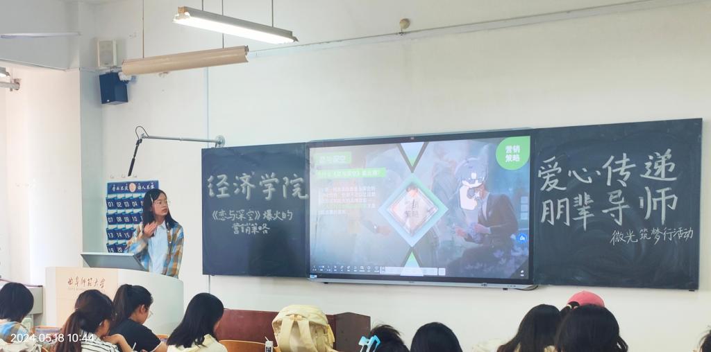 微光筑梦,提升综合素养。各学院结合“一院一品”推出形式多样、丰富新颖的特色活动。如马克思主义学院以红色文化剧本杀的独特形式开展课堂,将学生感兴趣的推理游戏融入课堂,使同学们在自主探究中理解知识、掌握知识;历史文化学院举办“缤纷扎染非遗技,巧妙斑斓绘千图”活动,为同学们体验具有地方特色的扎染文化提供平台,丰富同学们的课余文化生活;经济学院将教学视角转向当前爆火的游戏《恋与深空》,深入探讨其取得巨大成功的营销策略,将经济学知识运用到生活中,使同学们更好地读懂经济、运用经济。