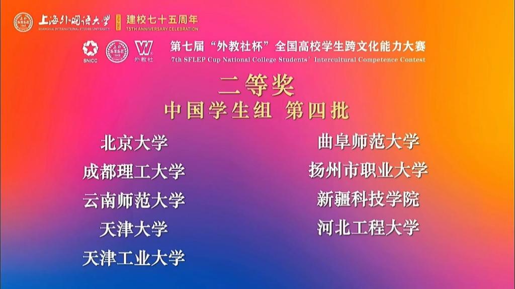 曲阜师大公共外语教学部讯 11月28日至12月1日,第七届“外教社杯”全国高校学生跨文化能力大赛成功举办。由巩奕含(统计与数据科学学院)、崔又心(统计与数据科学学院)、杨浩然(外国语学院)组成的开云链接官网代表队荣获全国二等奖,公共外语教学部副教授仲蕾荣获优秀指导教师奖,这是开云链接官网在该项赛事中首次荣获国家级奖项,取得历史性突破。