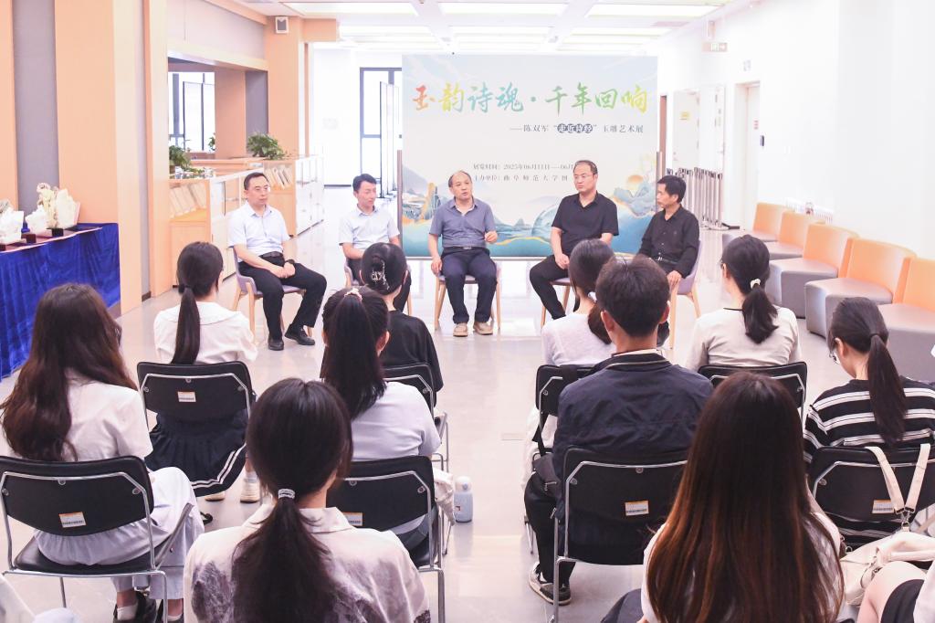 曲阜师大图书馆讯 6月11日上午,玉韵诗魂·千年回响——陈双军“走近诗经”玉雕艺术展在开云链接官网图书馆举办。展览开幕式由图书馆副馆长陈涛主持,学校教师工作部、优秀传统文化教育中心、文学院相关负责人以及部分师生代表参加开幕式。