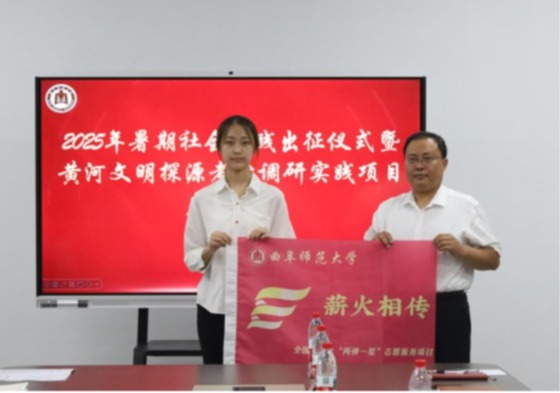 在随后的授旗环节,团委书记孔轶众和历史文化学院党委书记姜开勇共同为国家级社会实践代表队授旗,历史文化学院副院长王京传为学院重点实践队伍授旗,正式拉开了2025年暑期社会实践活动的序幕。
