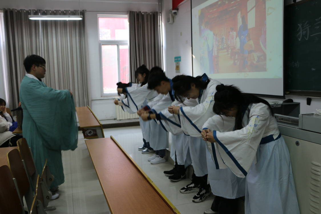 猗兰传统文化学社成员向同学们宣讲了孔子杏坛讲学、稷下学宫、嵩阳书院和岳麓书院相关历史渊源和名人风范,并重点阐述了古代学风对当代教育建设的现实意义、影响和传承。情景剧表演过程中,社团成员表演了古代学堂拜师仪式,学生以插手礼来表达自己对老师的恭敬和学习的诚心。参会同学纷纷表示,通过情景剧这一沉浸体验式教育活动,更加深了对优良学风、教风的理解,从而增强了献身教育事业的自觉和责任担当。身为思政专业的学生,要将马克思主义基本原理同中华优秀传统文化的结合提升到新的境界、新的高度,厚植文化自信,树立文化自觉。