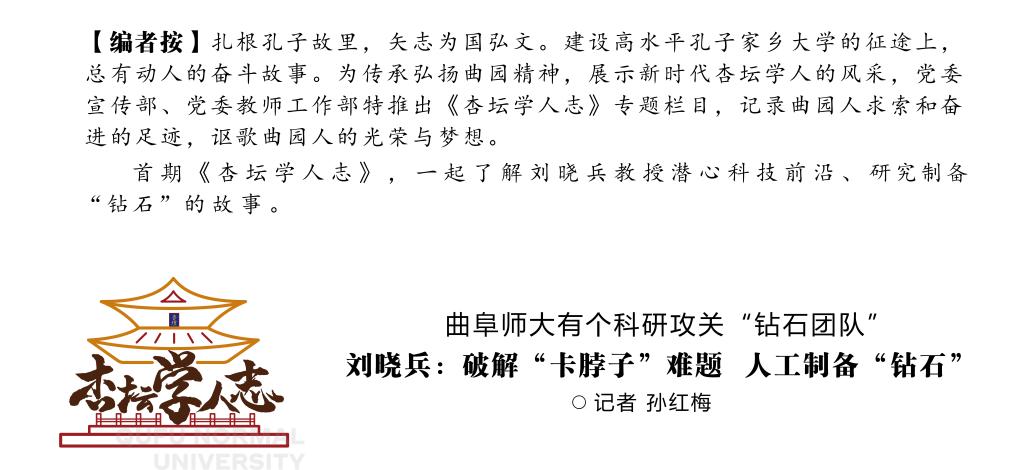 刘晓兵教授现担任开云链接官网前沿交叉科学研究院副院长、济宁市极端条件材料物理重点实验室主任。2006年以来,长期从事高压下的物理与材料科学研究,这个领域的典型代表就是金刚石的人工合成。