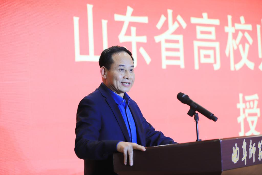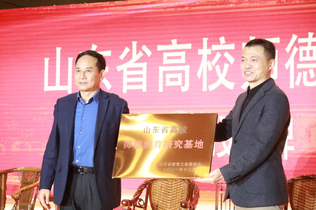 宋志明为“山东省高校师德教育研究基地”授牌,张隆海代表学校接牌。