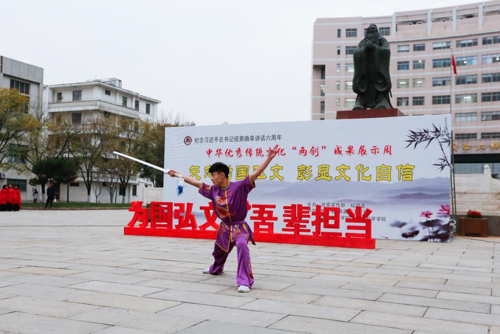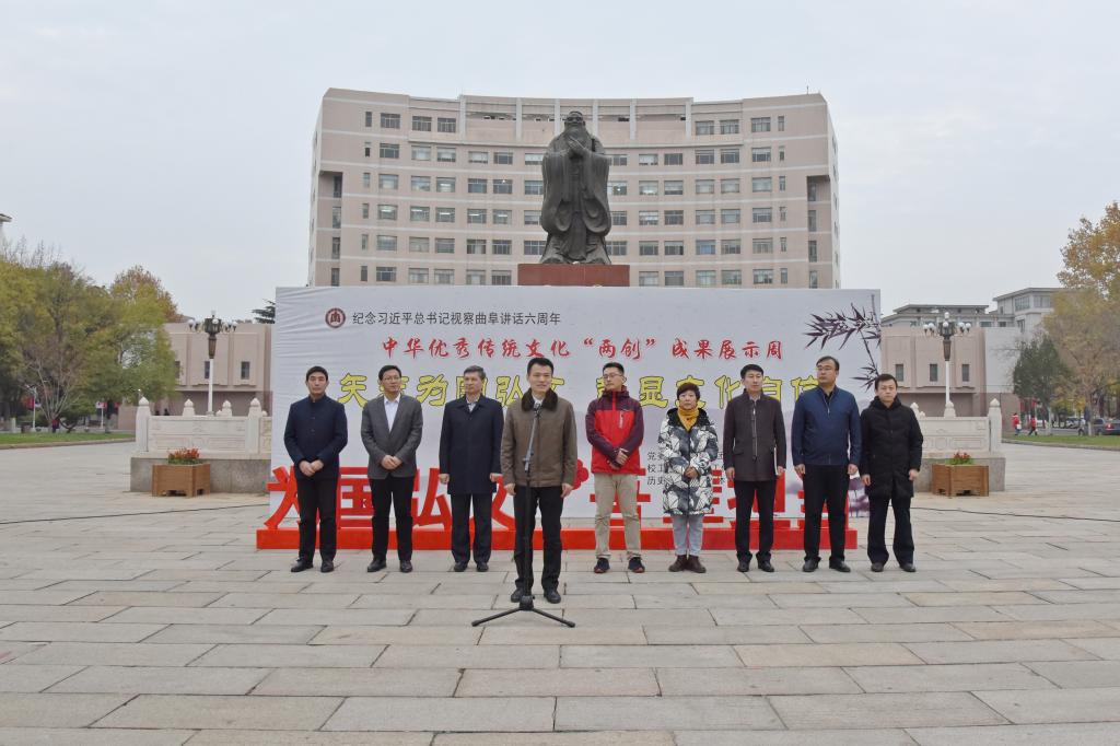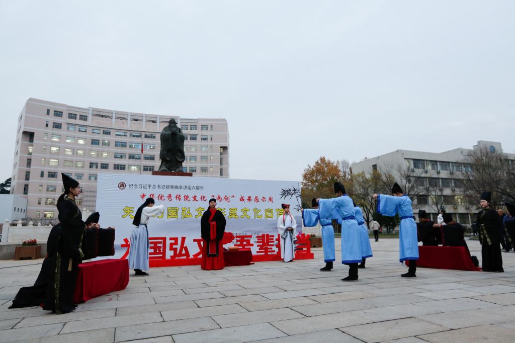 为纪念习近平总书记视察曲阜6周年重要讲话,推动落实“开云链接官网”战略,推进中华优秀传统文化在我校“创造性转化、创新性发展”,塑造以“韧性、睿性、德性”为核心的新时期曲园精神,我校党委宣传部、校团委、校工会、离退休工作处、历史文化学院、体育科学学院、书法学院等单位联合举办中华优秀传统文化“两创”成果展示周活动。11月26日下午,“两创”成果展示周活动开幕式在孔子文化广场举行。